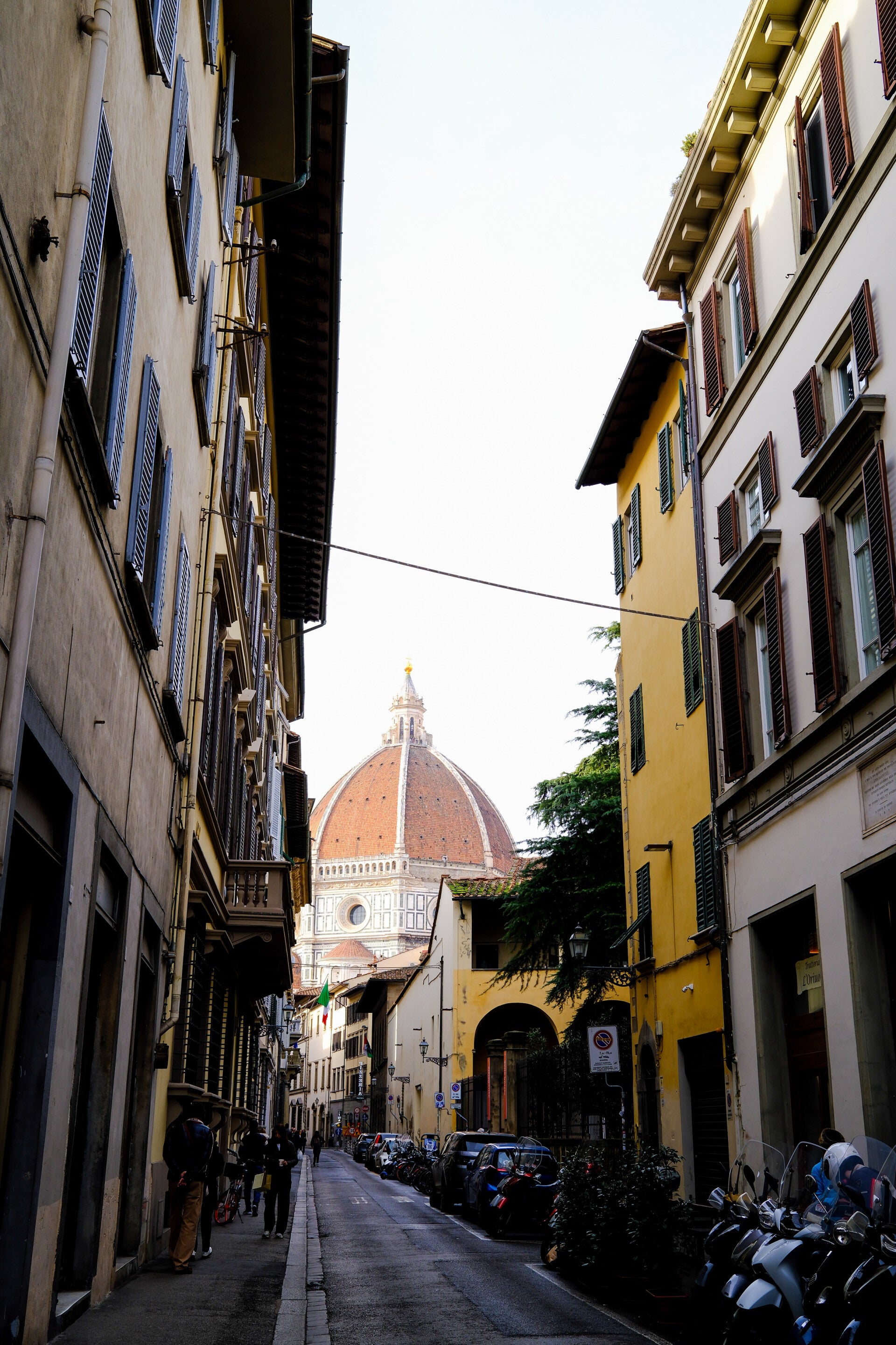 Ciao, Firenze! I began my Florence adventure on Friday morning bright and early with orientation for ISI! I walked over the Ponte Vecchio for the first time & got the first look at my new city in the daylight! At orientation we covered all the basics for the program & I got to feel settled for classes starting on Monday! We concluded orientation with a walking tour of the city center where I caught up with old UVA friends and met a bunch of new people on my program! I met Diana and Coco for lunch at Pizza Napoli 1955 and got the 1955 pizza with fresh cherry tomatoes, spicy sausage, pesto, and burrata! Still without luggage, we briefly shopped around at Zara, H&M, and took our first stroll through the leather market where I got myself a new green suede shoulder bag for class. We crossed the Ponte Vecchio back over to Santo Spirto and got the chance to admire this wonderful yellow umbrella on the bridge contrasted with the rainy weather. Diana, Coco, and I made notes of the cool vintage shops and leather stores we wanted to try later on & made our first stop at Conad, the local grocery store in our neighborhood. For Dinner, we went to the famous Alla Vecchia Bettola in Santo Spirito to try the slightly overhyped Penne alla Vecchia (a take on homemade vodka sauce) which was delish but has been beaten by other dishes I have had. Their house Chianti, on the other hand, was a delicious red to have with dinner.